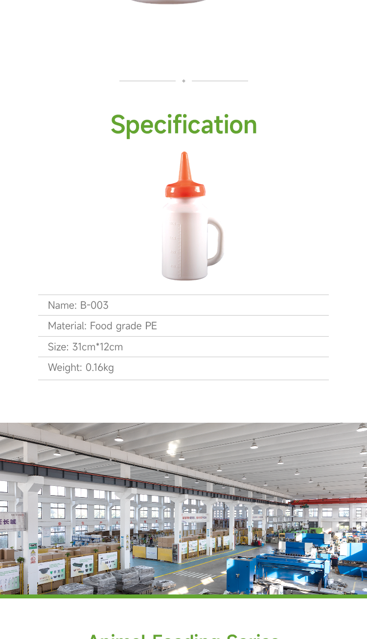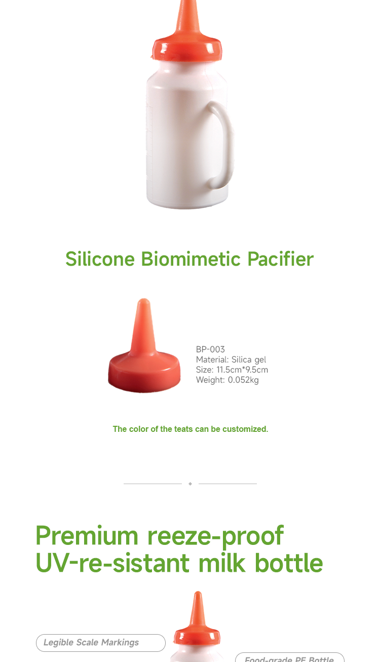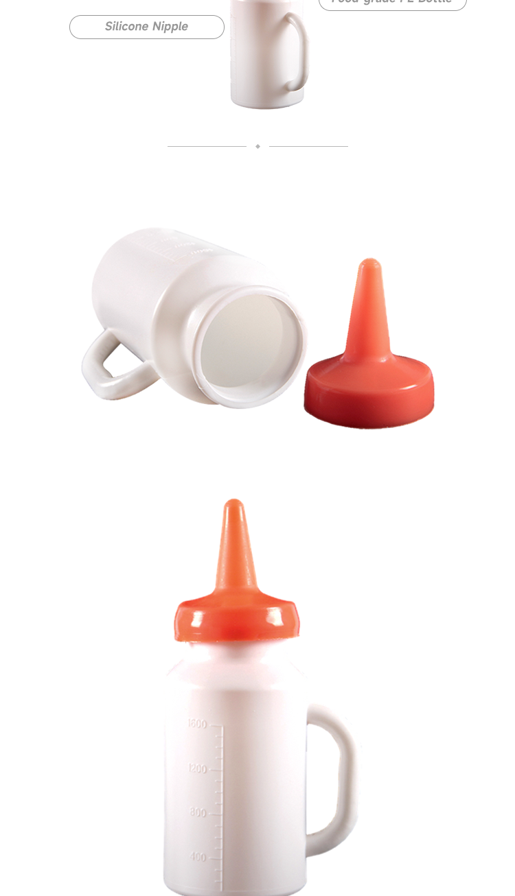 Animal drinking grandma bottle, food grade silicone nipple and food grade PE bottle body, high temperature resistant and disinfectant free from bisphenol A, biomimetic nipple resistant to biting and pulling, anti choking milk · Animal feeding bottles have clear markings on the bottle body, allowing for precise control of feeding volume; Closed bottle reduces the risk of bacterial contamination; · Biomimetic pacifier design promotes the development of calf oral muscles and avoids aspiration pneumonia caused by artificial feeding; · The bottle has a handle for easy manual feeding operation; · Food grade silicone nipple and food grade PE bottle body, resistant to high temperature disinfection and free of bisphenol A, ensuring safe use.