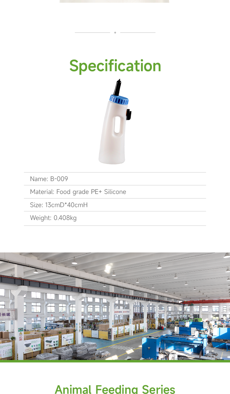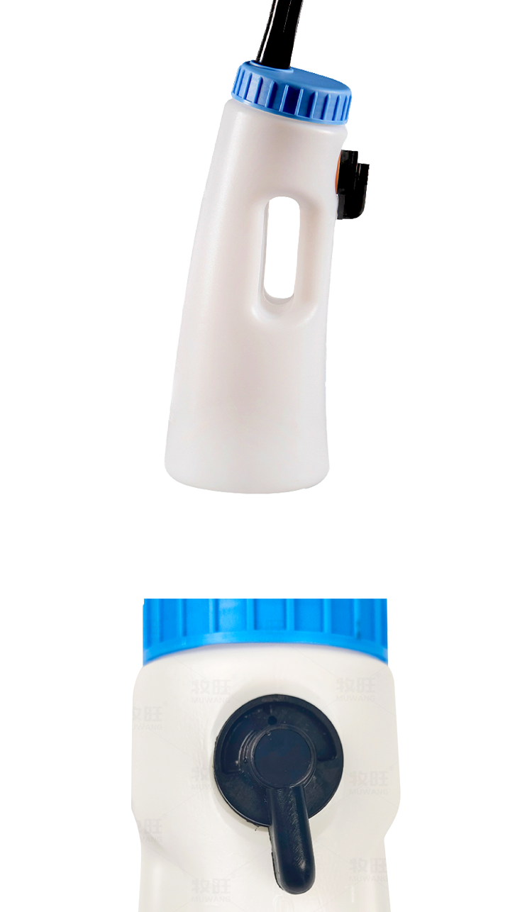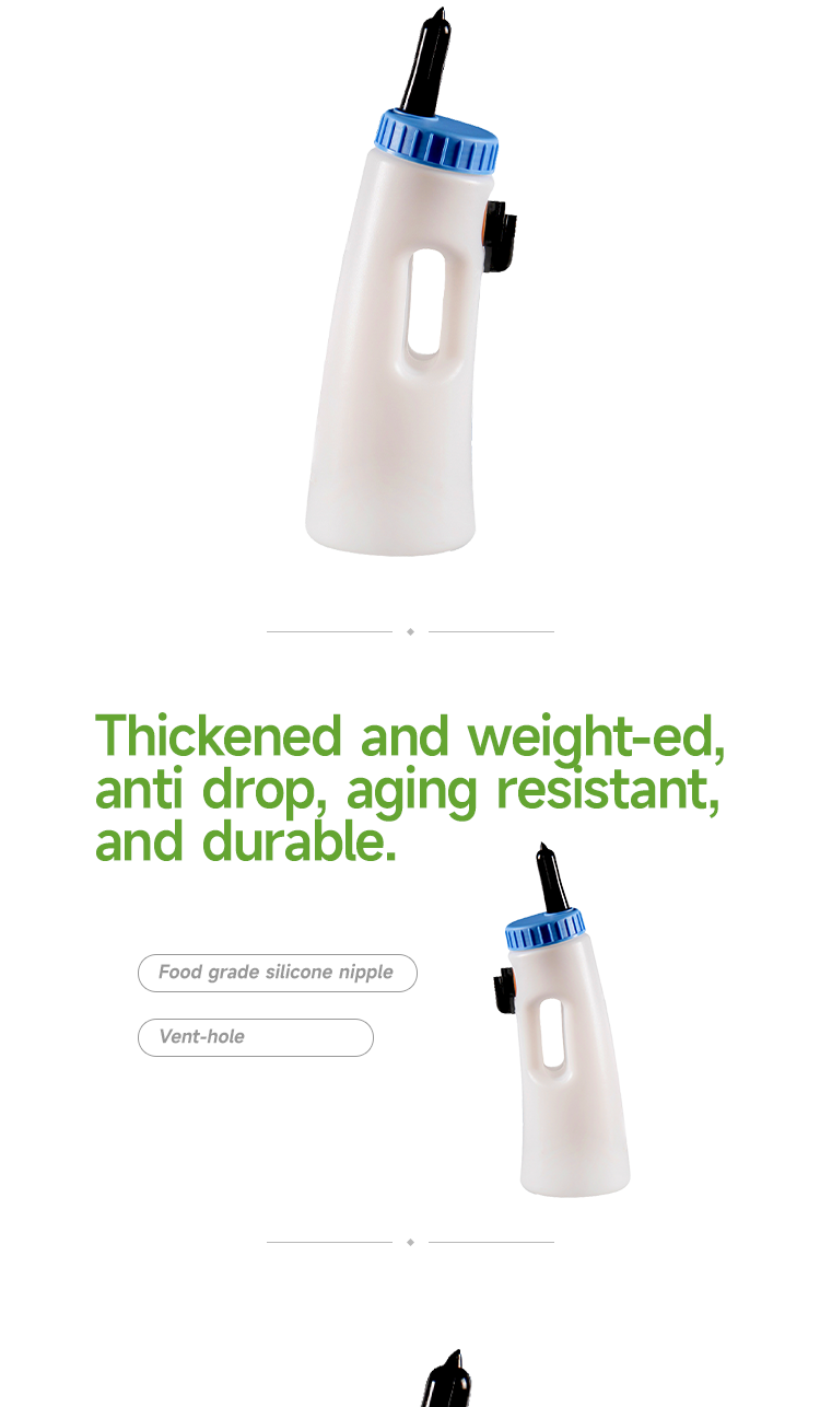 2.5L European style milk bottle with regulating valve to adjust milk flow rate · The bottle body has clear markings, which can accurately control the feeding amount; · The valve can adjust the milk flow rate to a gear suitable for the sucking ability of calves, avoiding coughing or aspiration pneumonia caused by excessive flow rate; · Biomimetic pacifier design promotes the development of calf oral muscles and avoids aspiration pneumonia caused by artificial feeding; · Food grade silicone nipple and food grade PE bottle body, resistant to high temperature disinfection and free of bisphenol A.Milk feeding bottle for calf