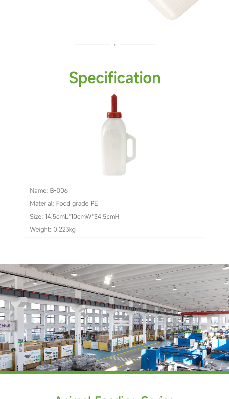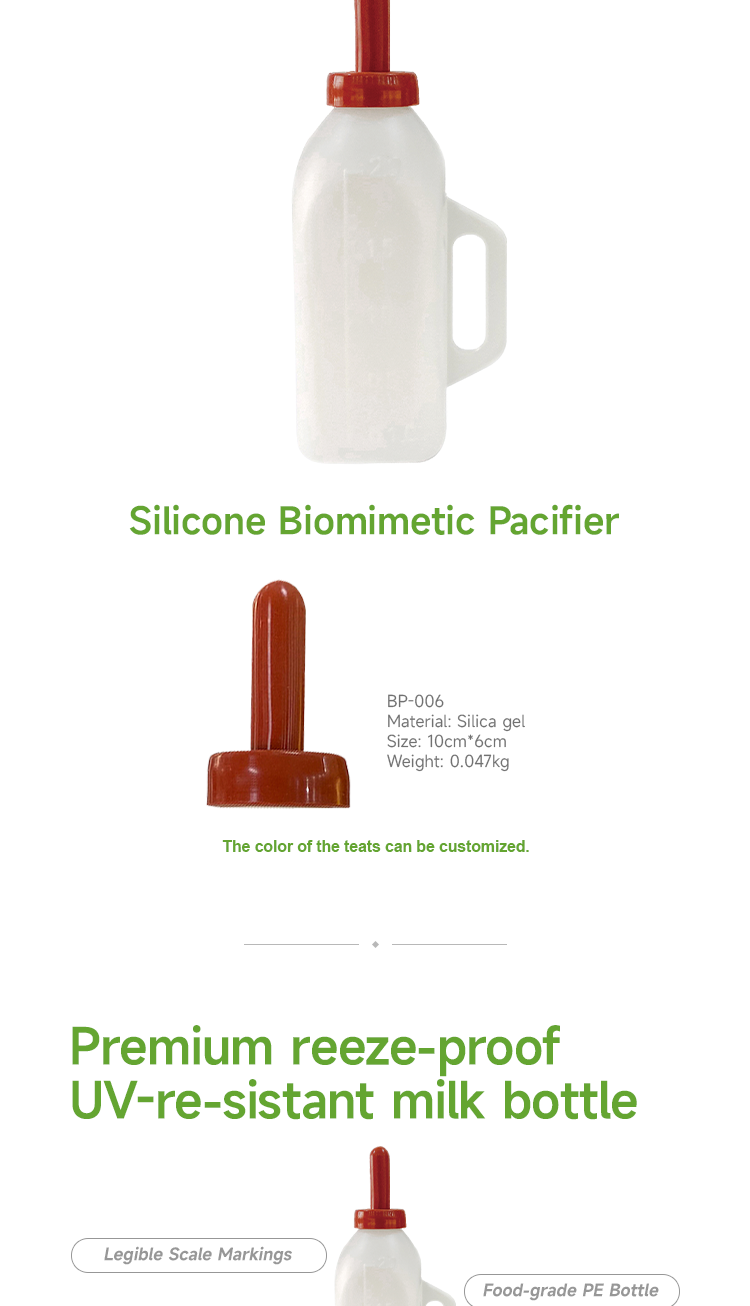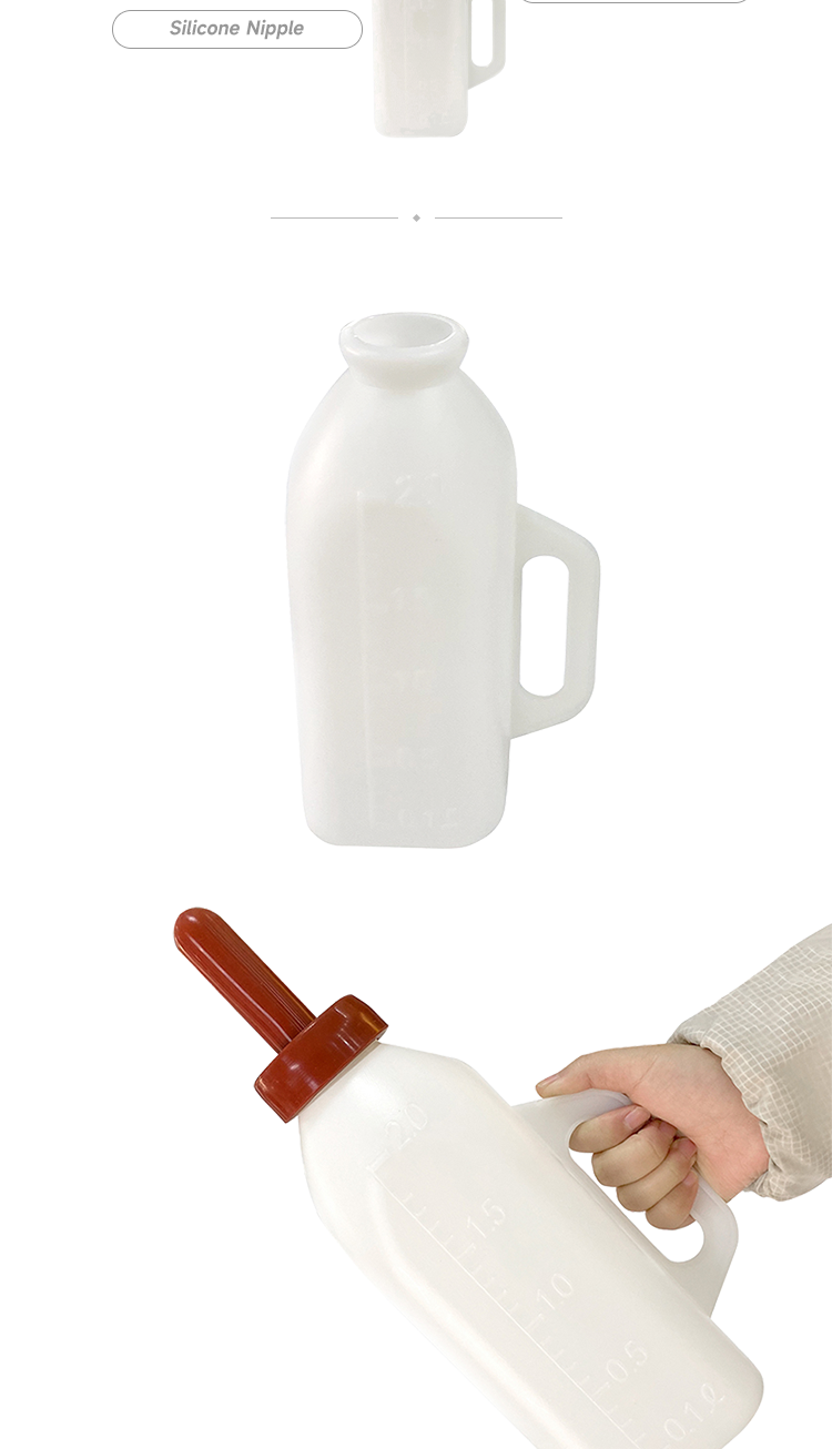 Animal drinking grandma bottle, food grade silicone nipple and food grade PE bottle body, high temperature resistant and disinfectant free from bisphenol A, biomimetic nipple resistant to biting and pulling, anti choking milk · Animal feeding bottles have clear markings on the bottle body, allowing for precise control of feeding volume; · Closed bottle reduces the risk of bacterial contamination; · The bottle has a handle for easy manual feeding operation; · Food grade silicone nipple and food grade PE bottle body, resistant to high temperature disinfection and free of bisphenol A, ensuring safe use.