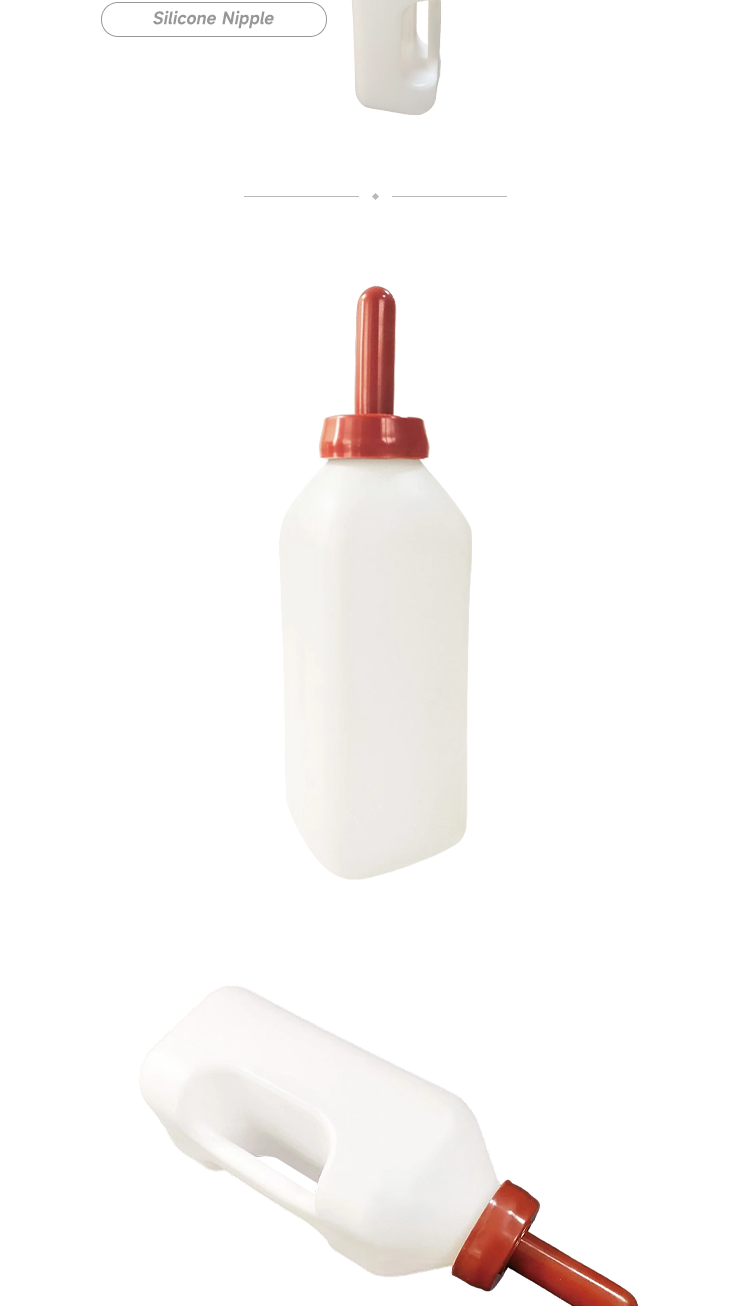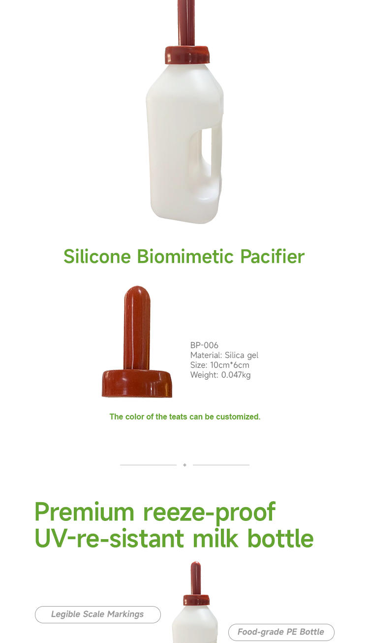 Animal drinking grandma bottle, food grade silicone nipple and food grade PE bottle body, high temperature resistant and disinfectant free from bisphenol A, biomimetic nipple resistant to biting and pulling, anti choking milk · The transparent bottle body can accurately control the feeding amount; · Closed bottle reduces the risk of bacterial contamination; · The bottle has a handle for easy manual feeding operation; · Food grade silicone nipple and food grade PE bottle body, resistant to high temperature disinfection and free of bisphenol A, ensuring safe use.