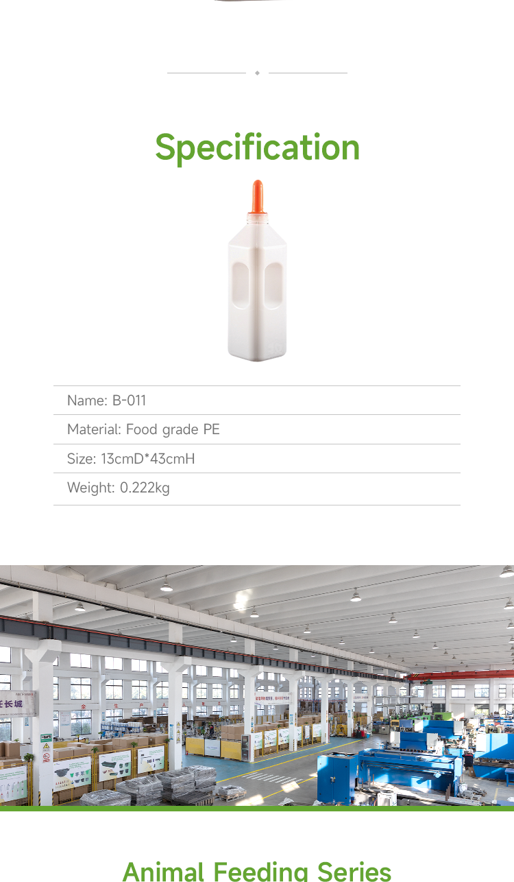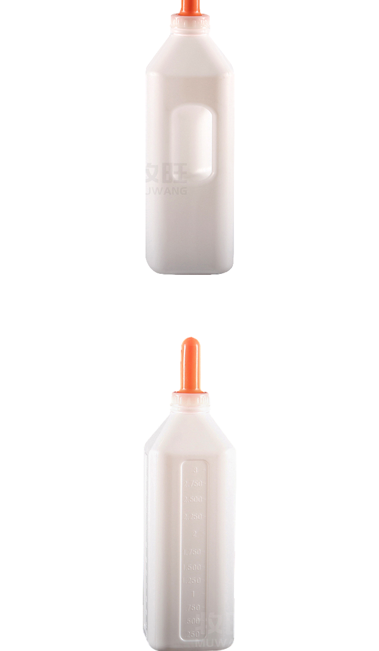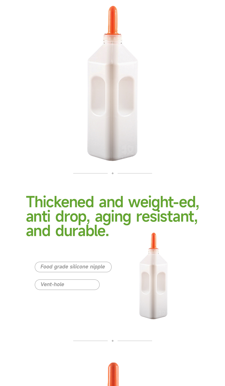 3L calf feeding bottle, animal drinking grandmother bottle, food grade silicone nipple and food grade PE bottle body, high temperature resistant disinfection and free of bisphenol A, biomimetic nipple resistant to biting and pulling, anti choking milk · Animal feeding bottles have clear markings on the bottle body, allowing for precise control of feeding volume; · Closed bottle reduces the risk of bacterial contamination; · Biomimetic pacifier design promotes the development of calf oral muscles and avoids aspiration pneumonia caused by artificial feeding; · Food grade silicone nipple and food grade PE bottle body, resistant to high temperature disinfection and free of bisphenol A, ensuring safe use.