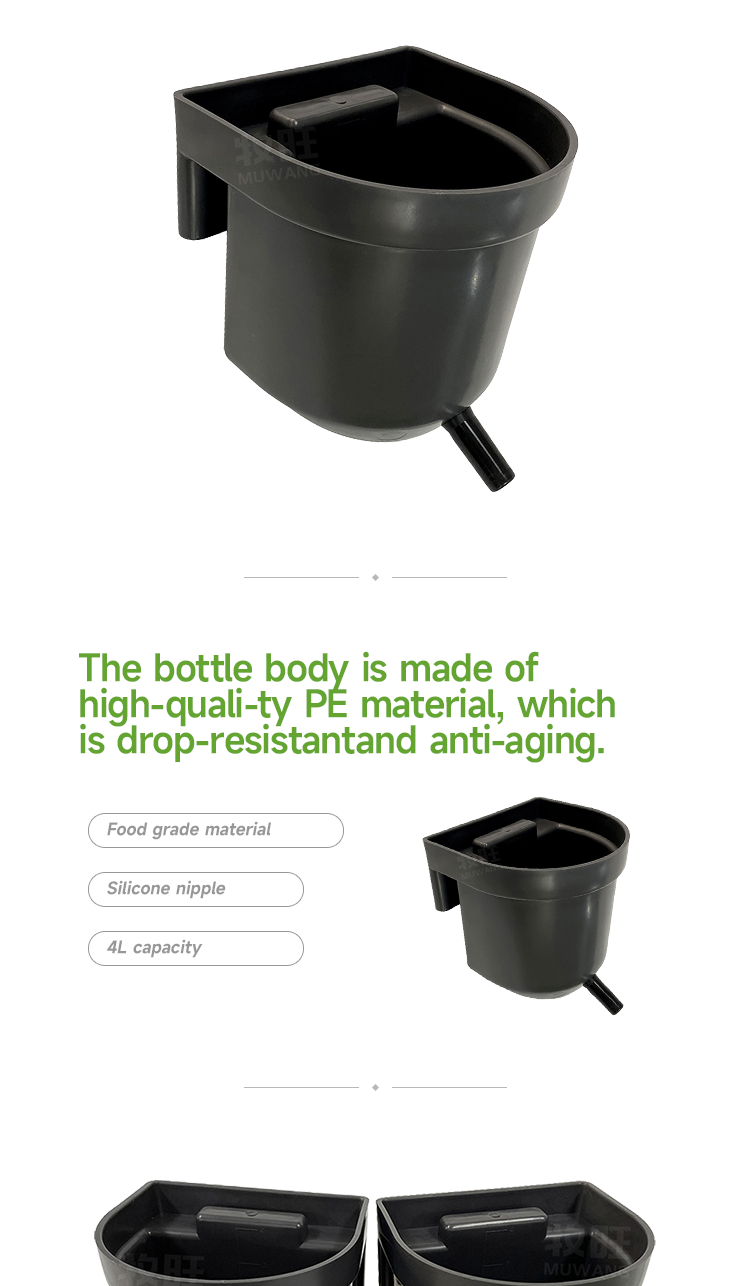 Single mouth calf feeding milk bucket, animal drinking grandmother bucket, food grade silicone nipple and food grade PE milk bucket, high temperature resistant disinfection and free of bisphenol A, biomimetic nipple bite resistant · 4L single mouthed milk bucket, calf feeding milk bucket, silicone nipple, food grade material, anti drop and durable; · There is a hook at the back that can be fixed; · The pacifier can be replaced conveniently and quickly; · There are markings on the milk bucket to control the feeding amount and ensure scientific feeding;