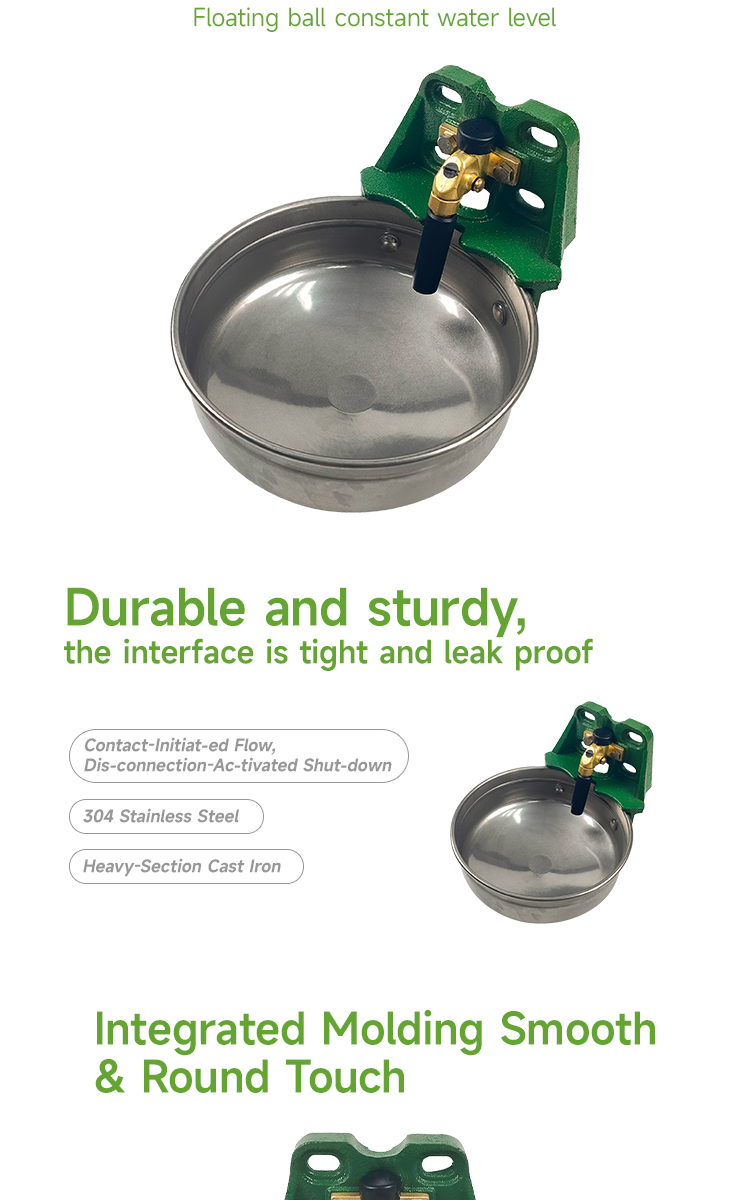 5L large capacity drinking bowl, stainless steel bowl body, cast iron back plate, impact resistant and not easily damaged, anti mold, antibacterial, rust proof and corrosion-resistant · The 304 stainless steel drinking bowl for cows is designed with a scientific water flow rate and triggering mechanism to provide on-demand water supply, avoiding the problem of excessive or insufficient drinking water for cows and improving water conservation rates. At the same time, the durability design of the drinking bowl extends its service life. · 304 stainless steel bowl body, brass valve, mold proof, antibacterial, rust proof, and corrosion-resistant; The bowl body is smooth, making it easy to clean residual impurities.