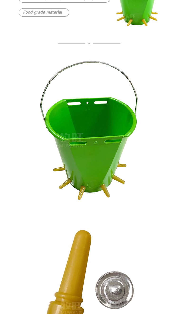 Animal feeding bucket, six mouthed bucket, lamb feeding bucket, food grade material · Animal feeding milk bucket, 8L capacity, six mouthed lamb milk bucket, food grade material; · The barrel has clear markings that allow for observation of the amount of milk consumed; · Food grade silicone nipple, biomimetic design, soft, bite resistant, and anti choking milk; Food grade PE barrel body, resistant to high temperature disinfection and free of bisphenol A · The milk bucket can be hung and fixed, freeing up manpower; · Milk bucket feeding is suitable for large-scale farm management.