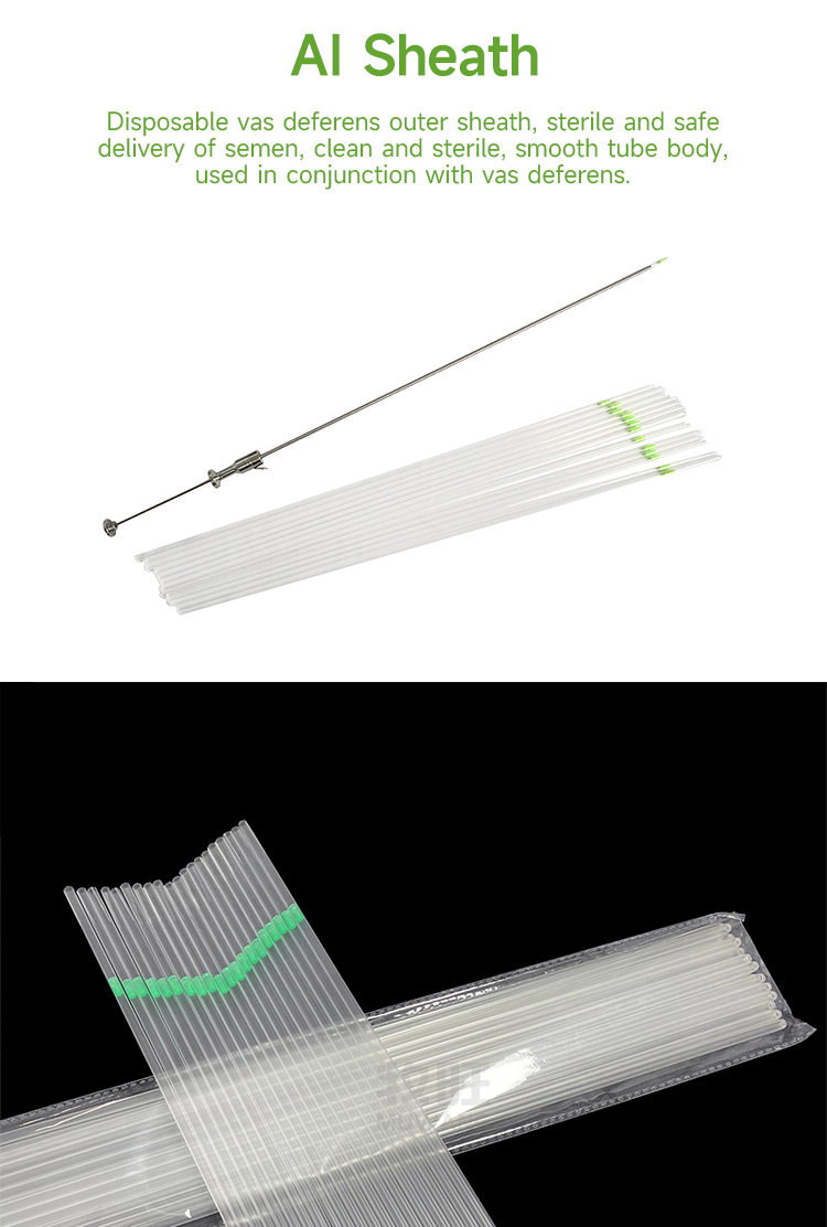 Disposable vas deferens outer sheath, sterile and safe delivery of semen, clean and sterile, smooth tube body, used in conjunction with vas deferens · A disposable vas deferens outer sheath ensures sterile and safe delivery of semen, with a smooth tube body, and is used in conjunction with the vas deferens; · High quality PP material is non-toxic and harmless, and does not react with semen diluent or cryoprotectants; Recyclable; · Round headed front end, smooth without burrs, does not harm animals; · The tube adopts a U-shaped closure and a specially designed push type plug, which can push out the semen inside the thin tube.