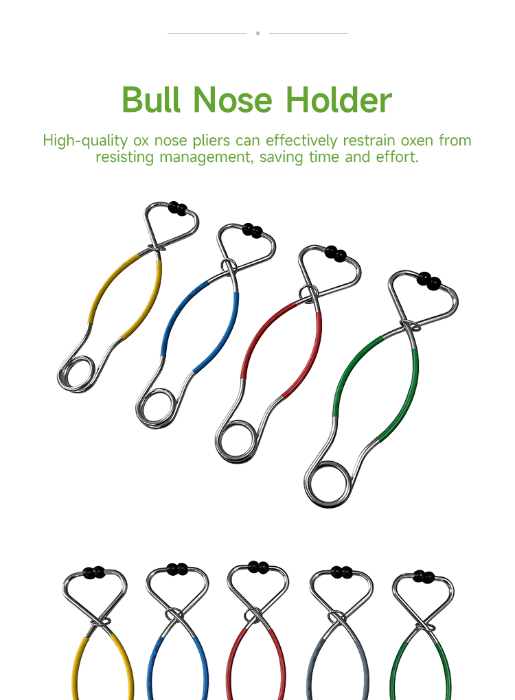 High quality spring steel material, not easily deformed after frequent use, sturdy and durable with high hardness and wear resistance, with a nose ball shaped design, strong clamping force, and smooth polishing without damaging the cow; Comes with a lock buckle, freeing hands · Traction of Baoding forceps, using an arc-shaped structure that fits snugly against the bovine nasal septum to avoid slipping or injury; · Using high-quality spring steel material, it is not easily deformed after frequent use; · Smooth edge treatment of the jaw to prevent scratching of the cow's nose or the operator; · Comes with a locking buckle, freeing up both hands; Rubber coated handle, non slip and not tiring to the hands;
