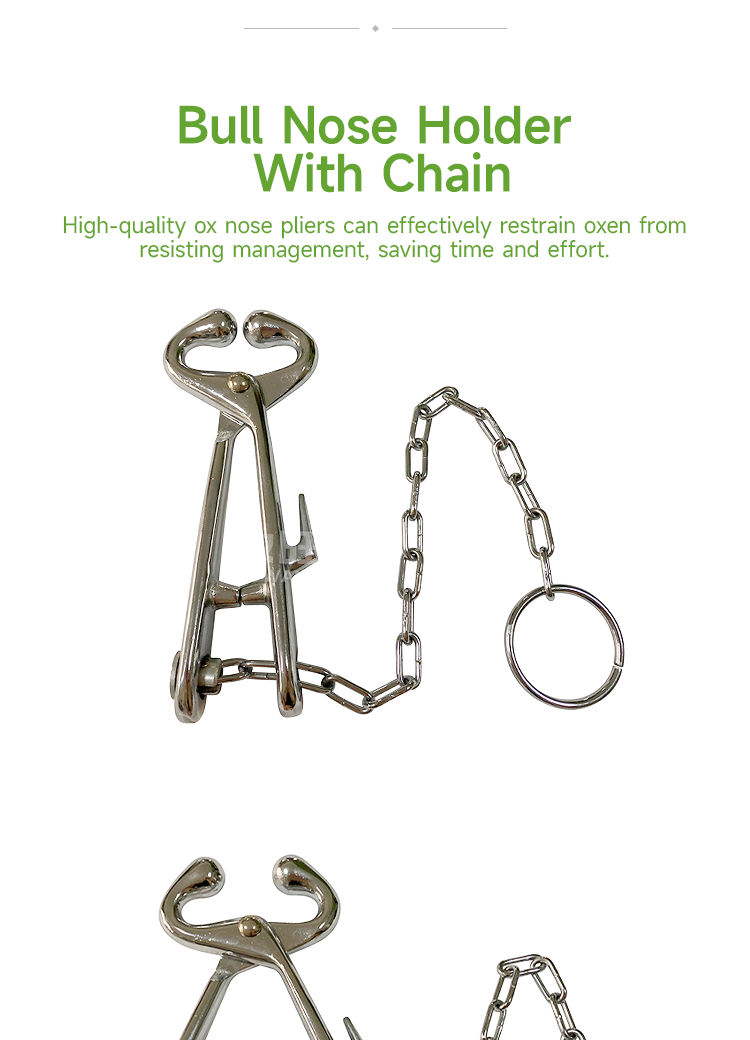 Metal bull nose pliers, made of high-quality spring steel material, sturdy, durable, hard and wear-resistant, with a nose ball shaped design and strong clamping force · Traction of Baoding forceps, using an arc-shaped structure that fits snugly against the bovine nasal septum to avoid slipping or injury; · Using high-quality spring steel material, it is not easily deformed after frequent use; · Smooth edge treatment of the jaw to prevent scratching of the cow's nose or the operator;