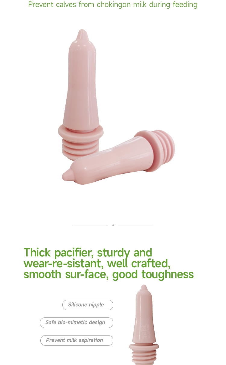 Peach shaped pacifier, animal feeding silicone pacifier, double-sided milk does not choke, anti reflux pacifier · Calf feeding pacifier, made of silicone material, soft and bite resistant, resistant to high temperature disinfection, and free of bisphenol A; · Double sided milk delivery design to prevent milk from flowing directly into the esophagus and trachea, without choking the calf; · Anti reflux design, avoiding direct impact of milk on the esophagus and trachea, reducing the probability of choking on milk;