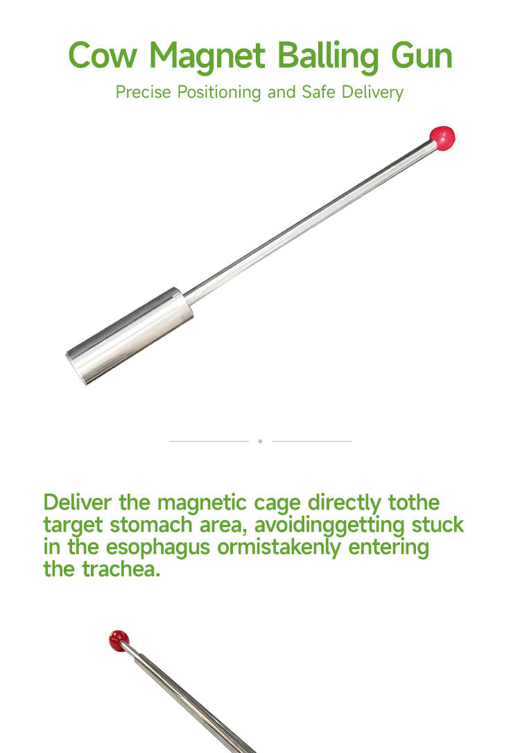 Stainless steel magnetic cage feeder, made of stainless steel material that is corrosion-resistant and easy to clean, with a smooth head that does not harm the cow's mouth and esophagus · The magnetic cage feeder can accurately place the magnetic cage into the rumen of cattle; · The head of the feeder is designed to be rounded to avoid scratching the cow's mouth or esophagus; · Made of stainless steel material, it can resist the corrosion of gastric acid and prevent rusting; High surface smoothness reduces the risk of bacterial adhesion; · Large caliber cartridges can be used to dispense magnetic cages and veterinary drugs up to 38mm in size;