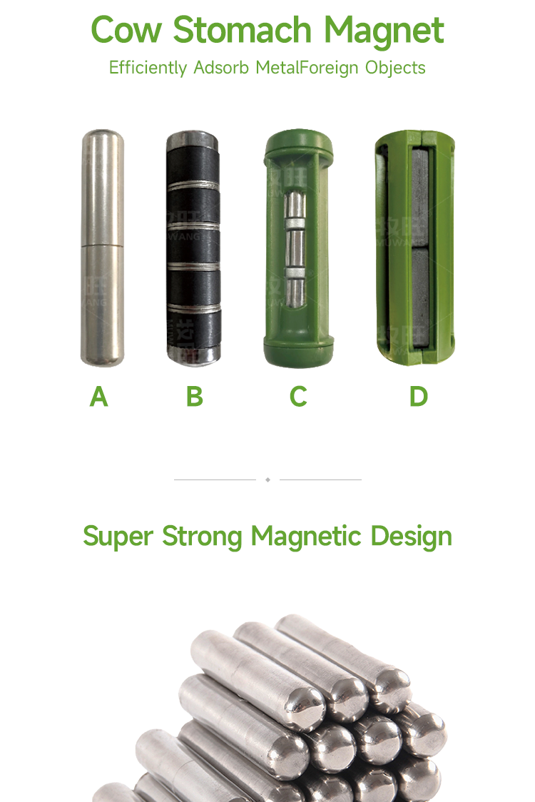 Rumen iron absorber for cows, used to absorb iron impurities such as iron wires and nails in the rumen of cows · Preventing cows from accidentally ingesting metal foreign objects can reduce the risk of cattle ingesting metals; · Used to adsorb iron foreign objects such as iron wires and nails in the rumen of cows, and prevent diseases such as traumatic reticulum pericardium peritonitis.