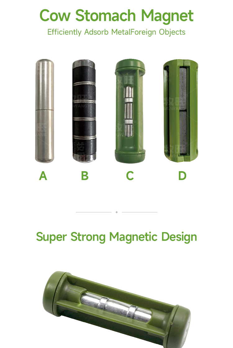 Cow rumen magnet · Preventing cows from accidentally ingesting metal foreign objects can reduce the risk of cattle ingesting metals; · Used to adsorb iron foreign objects such as iron wires and nails in the rumen of cows, and prevent diseases such as traumatic reticulum pericardium peritonitis. · The plastic shell can prevent the magnet from directly contacting the inner wall of the rumen, reducing the risk of friction damage; · The plastic layer isolates the corrosion of the magnet by gastric acid, extending its service life;