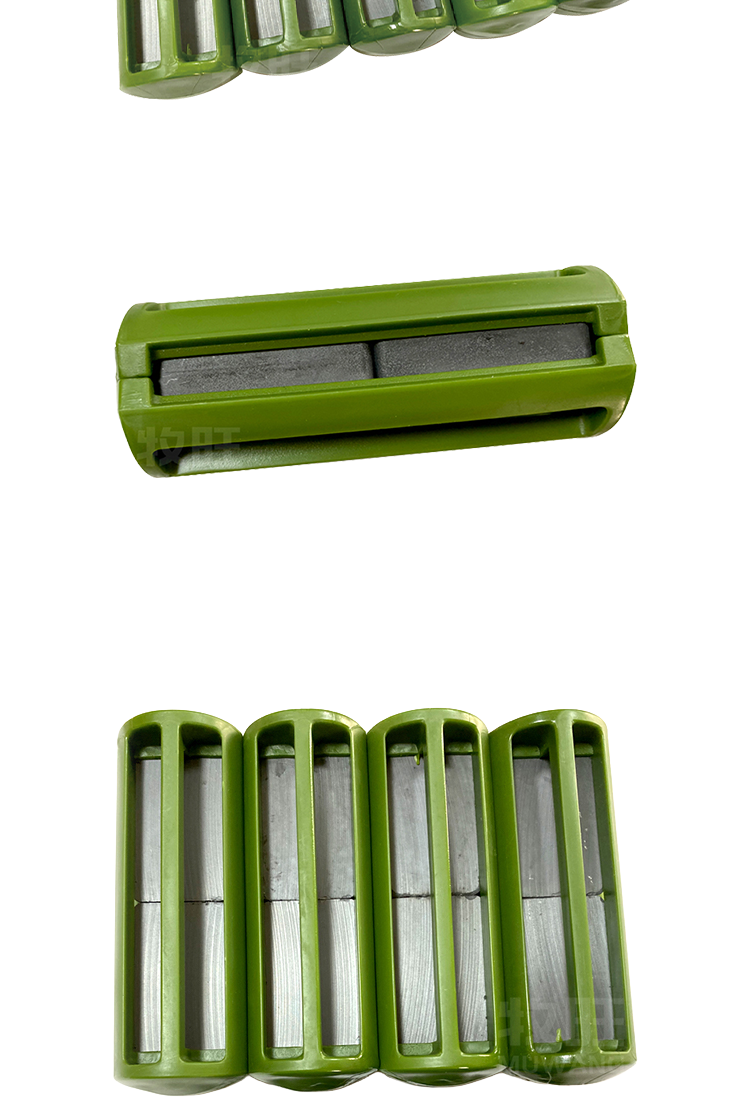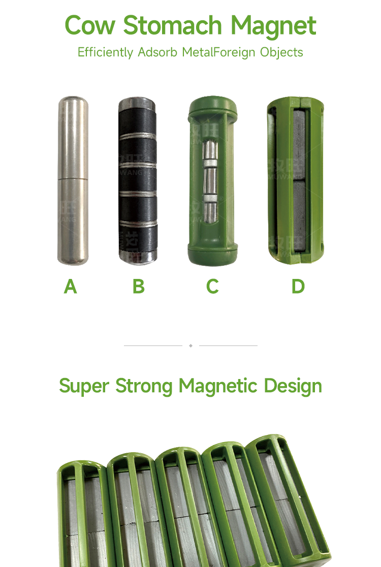 Rumen iron absorber for cows, used to absorb iron impurities such as iron wires and nails in the rumen of cows · Strong magnet, with strong adsorption force, effectively removes iron nails and debris from the rumen; · High quality magnets, wrapped in plastic shells with groove design for convenient storage of iron filings; Non toxic and harmless; · Healthy and hygienic, can be stored in the tumor stomach for a long time;