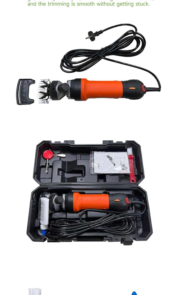 Electric wool clipper, high-power wool shearing tool, sharp blade for quick and powerful shearing, adjustable claw tightness, versatile for multiple sheep, easy hair removal · Electric wool shears equipped with Beiyuan blades, sharp and wear-resistant blades; · Easily deal with thick layers of wool such as sheep and goats, with efficiency increased by more than 5 times compared to manual tools. · The replaceable blade design enables precise control from short hair trimming to coarse hair processing. · Suitable for high-intensity operations in large-scale breeding farms.
