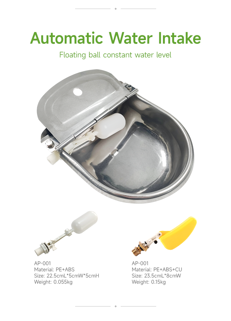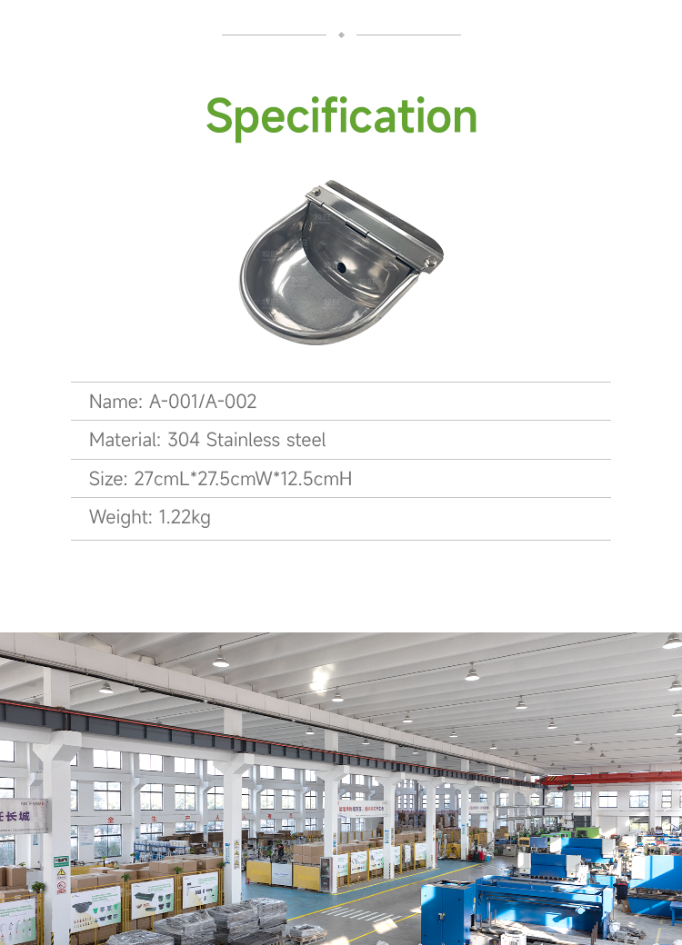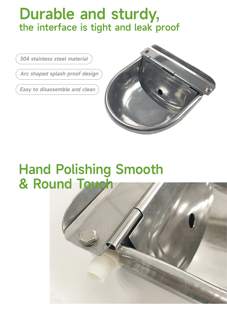 Stainless steel drinking bowl, animal drinking water equipment, automatic water inlet, finely crafted, exclusively for breeding farms · 304 stainless steel drinking bowl for cattle in breeding farms, automatic water inlet, smooth bowl body, convenient for cleaning residual impurities; · The cow drinking bowl avoids the problem of overeating or insufficient drinking water in traditional water tanks through scientifically designed water flow rate and triggering mechanism. · Simplify the management process, reduce the labor intensity of management personnel, and at the same time, the durability design of the drinking bowl extends its service life and reduces the frequency of equipment replacement.
