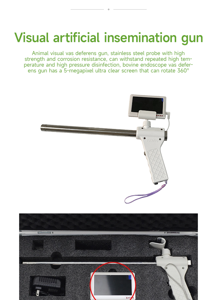 Animal visual vas deferens gun, stainless steel probe with high strength and corrosion resistance, can withstand repeated high temperature and high pressure disinfection, bovine endoscope vas deferens gun has a 5-megapixel ultra clear screen that can rotate 360 ° The visual vas deferens gun achieves real-time image transmission within the reproductive tract of cows/sheep by integrating a miniature high-definition camera, a wide-angle lighting system, and a rotating display screen. The operator can accurately locate the cervical opening, and with the help of a constant temperature heating probe and a thin tube vas deferens channel, the semen can be directly injected into the optimal conception area, significantly improving the conception rate compared to traditional blind insertion.